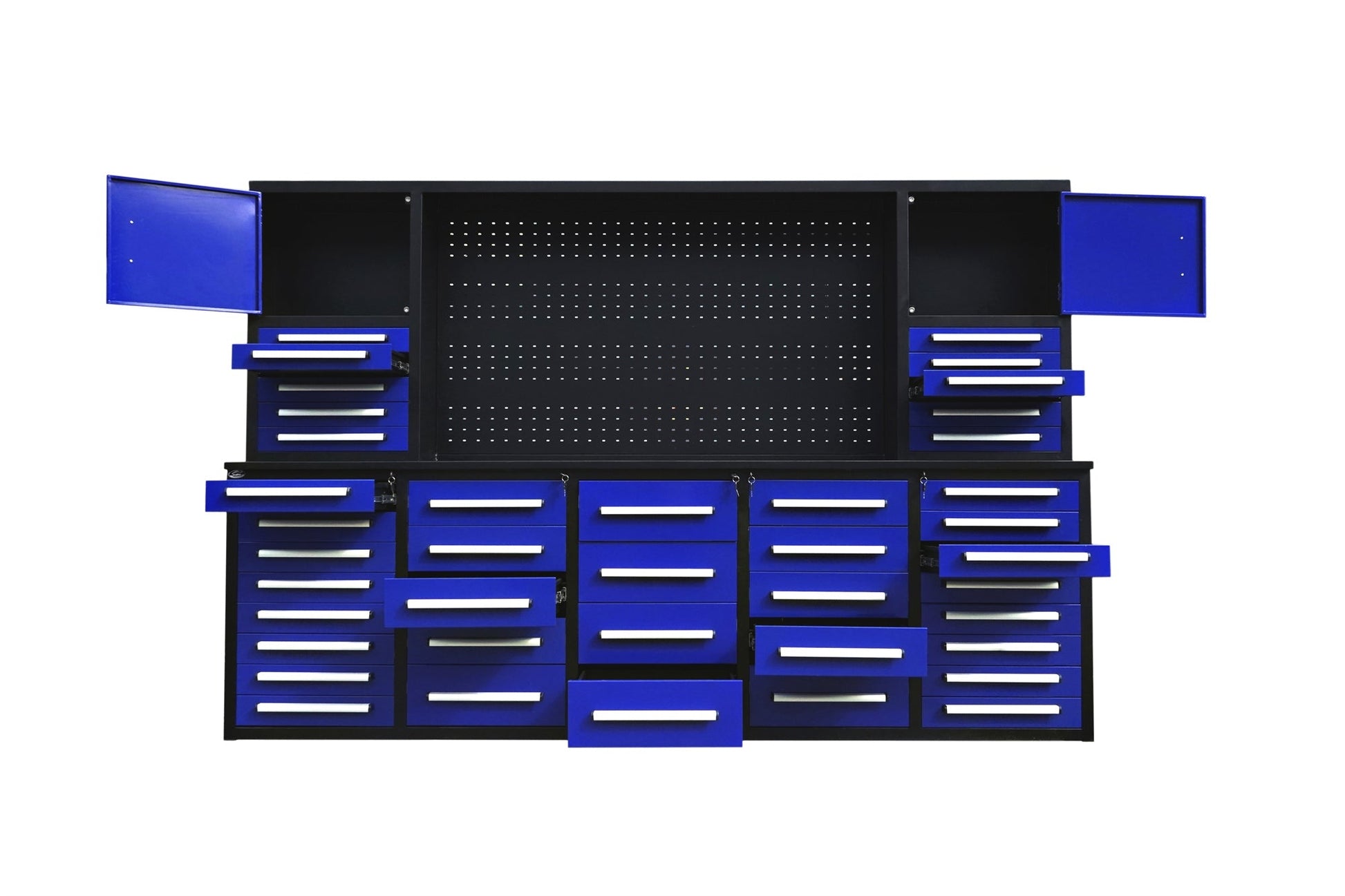 This expansive 10' storage cabinet integrates a workbench with 40 drawers, 2 cabinets, and a pegboard, providing exceptional organizational capacity. Delivered fully assembled as a single unit, it eliminates installation time and includes premium features like drawer liners. This enhanced version offers increased storage capacity and an extended workbench surface compared to the 7' model, maximizing both storage efficiency and workspace functionality.