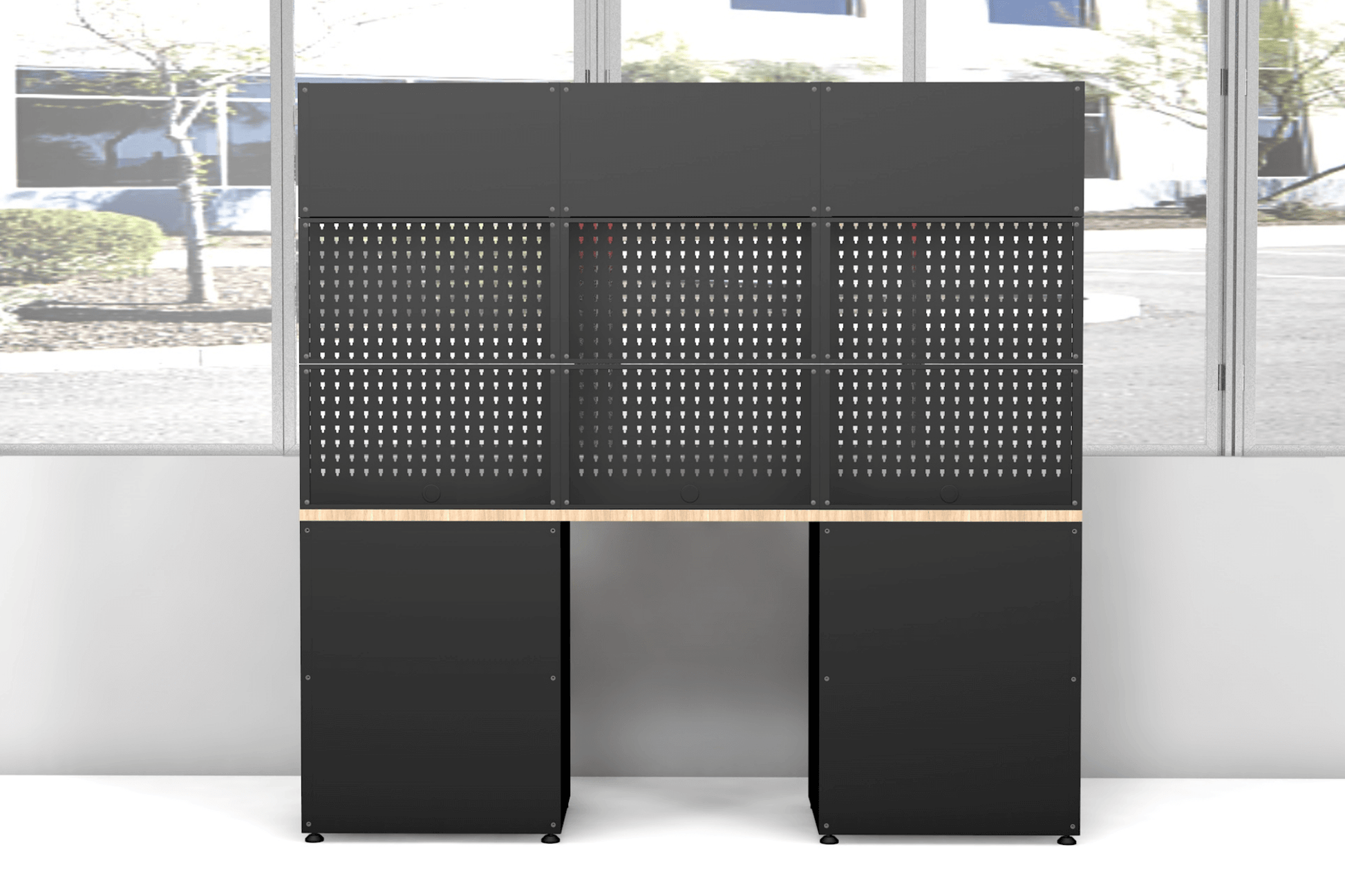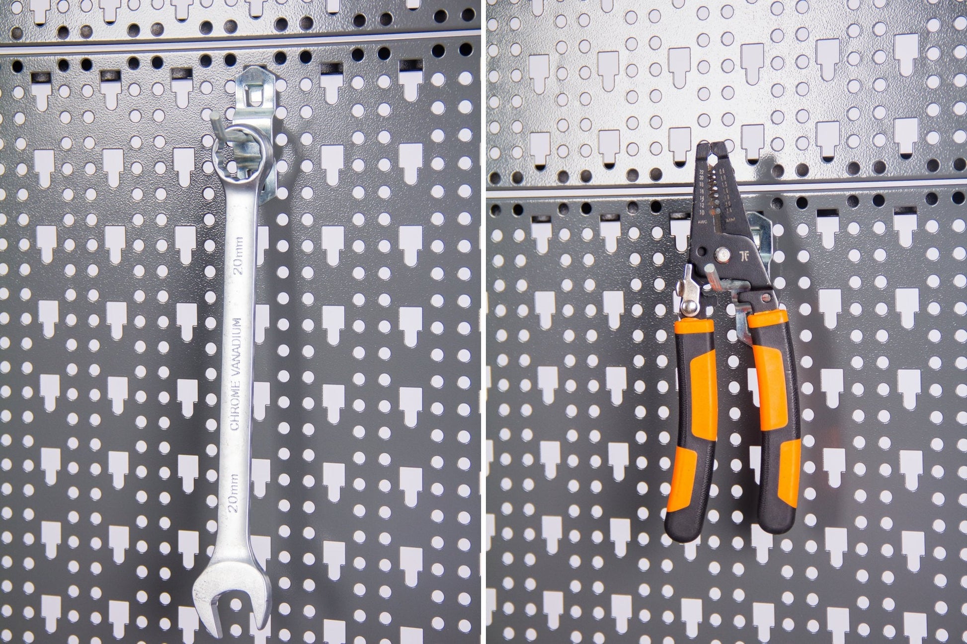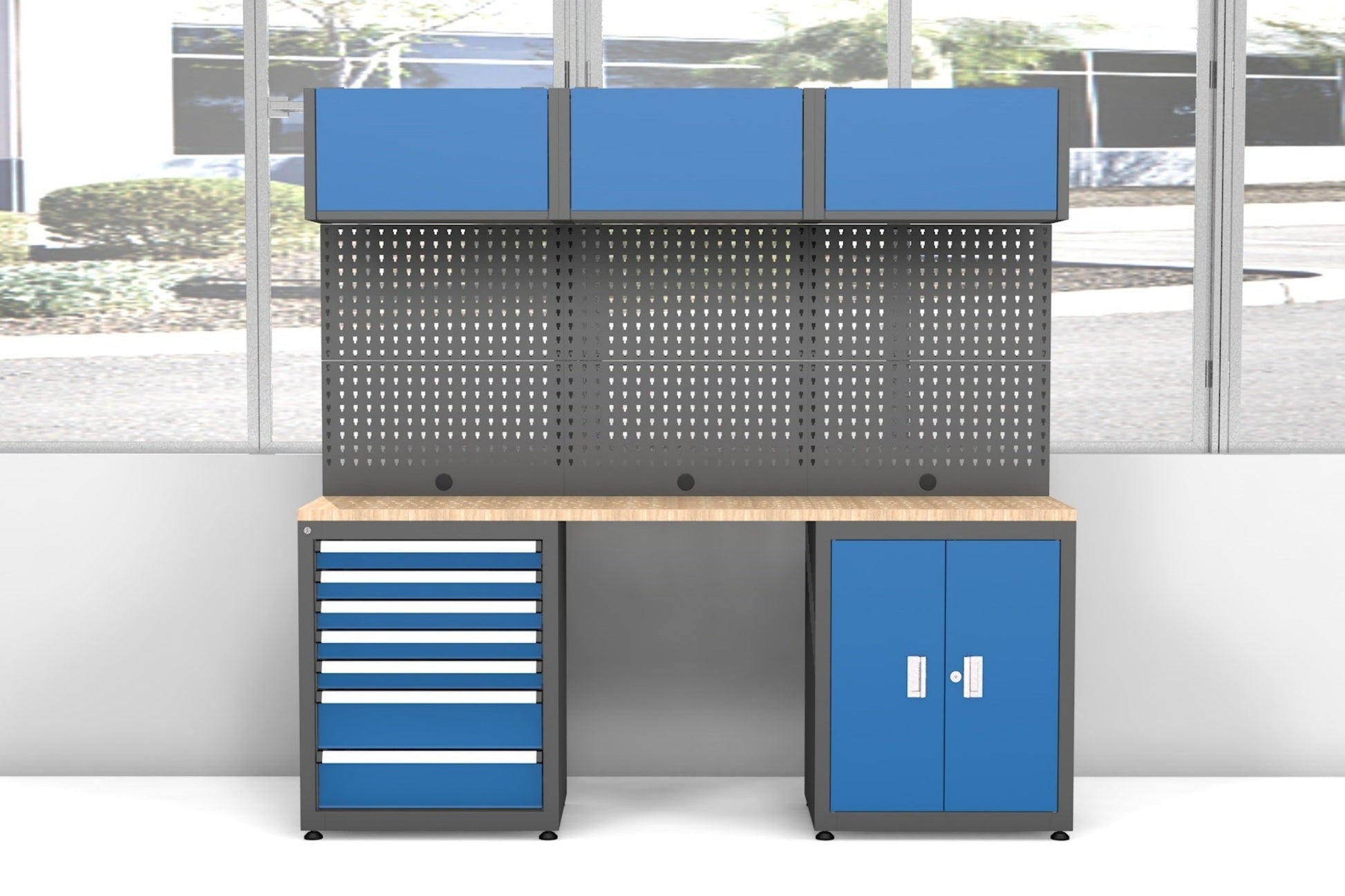 Experience the practicality of the Steel Workshop Cabinet System, designed for optimal organization. Featuring seven drawers with smooth ball-bearing slides, tool access is effortless. The double-door cabinet, equipped with a secure lock, provides safe storage for larger items. Its top cabinet and backplate maximize available space, while four adjustable feet ensure stability on uneven floors. The backplate supports three types of holes for diverse hook options, enhancing storage flexibility. This system is engineered to improve workshop efficiency by keeping tools and materials organized and easily accessible.